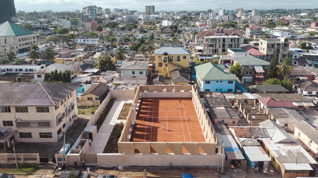 Four-metre-high rammed-earth walls frame the plot of Backyard Community Club in Accra, Ghana, completed by local studio DeRoche Projects.