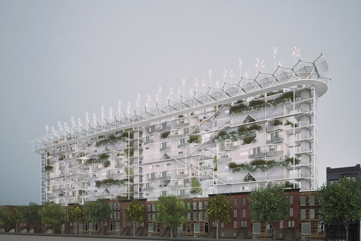 Some explore adaptability within existing urban and social fabrics. Such as Ho-gyeum Kim’s Growing Rowhouses proposes modular, steel-framed vertical additions to the backyards of New York City homes. It densifies neighborhoods without erasing them, creating semi-private terraces and shared courtyards that encourage community interaction.