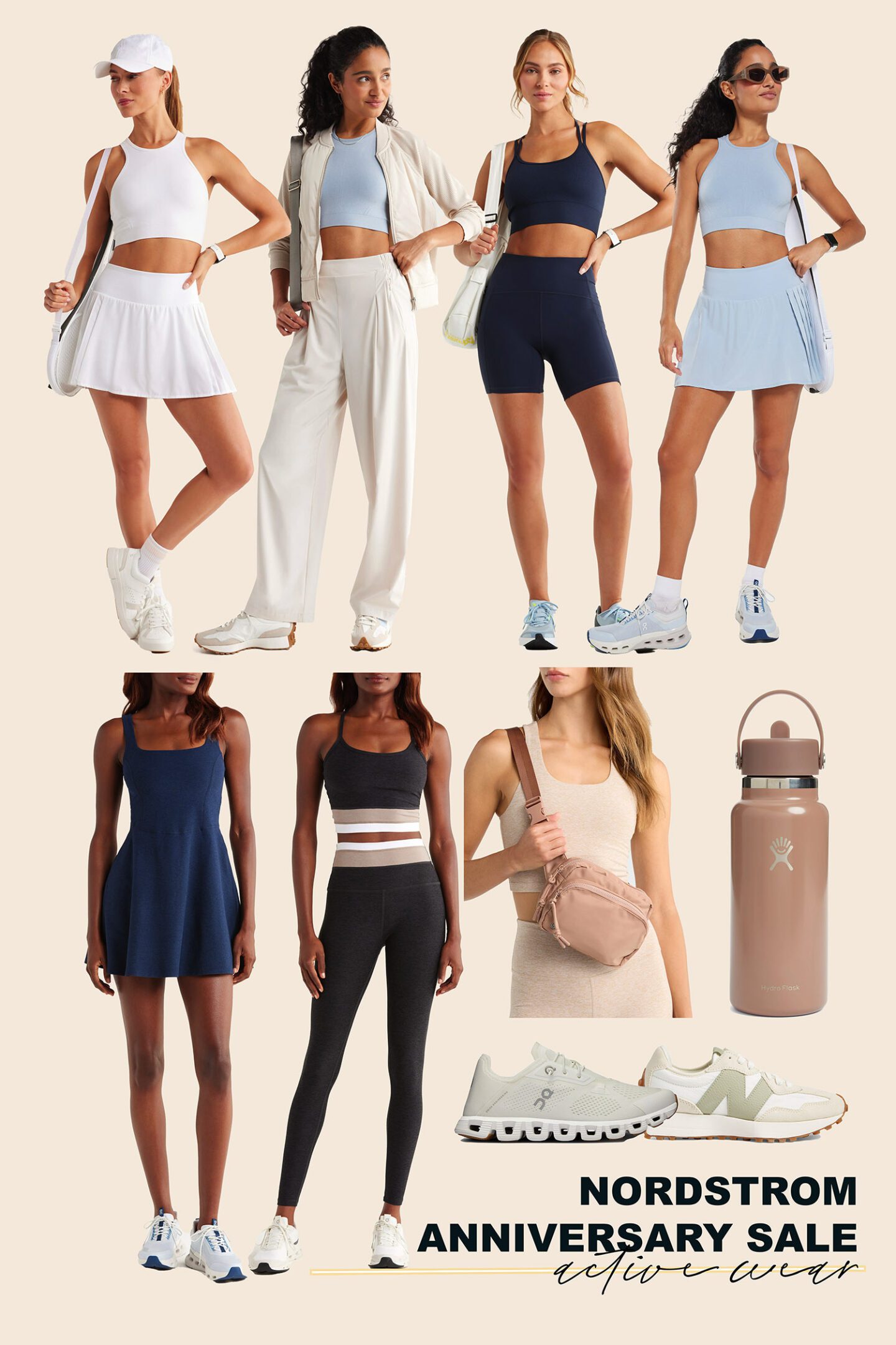 Zella Racerback Sports Bra ($27.99), Zella Skirt ($49.99), Zella Mixed Media Bomber Jacket ($85.99), Zella Studio Luxe Bike Shorts ($39.99), Zella Racerback Sports Bra ($27.99), Zella Skirt ($49.99), Garden Party Minidress ($84.99), Beyond Yoga Colorblock Bra ($48.99) and Leggings ($72.99), Zella Crossbody Bag ($19.99), Cloud Sneakers ($109.99), New Balance Sneakers ($79.99), Flask ($29.99)