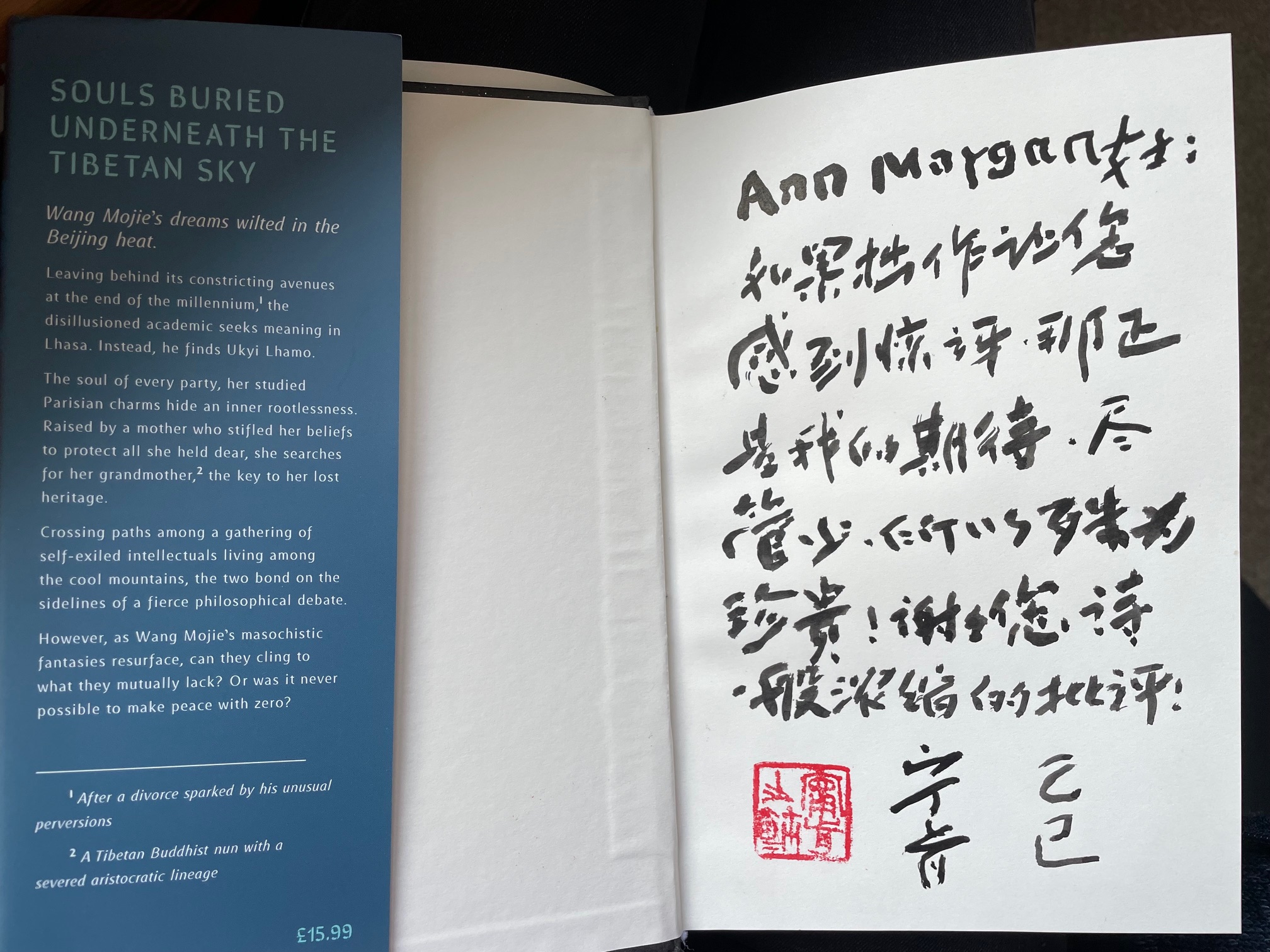 One of the lovely things about this project is the interactions I’ve had through it with writers around the world. The Chinese literary master Ning Ken is a great example. After I gave a quote to support Thomas Moran’s English translation of Tibetan Sky, I received a copy of the finished book sent from Beijing, inscribed with a message of thanks from the author as shown above. His publisher tells me it means: