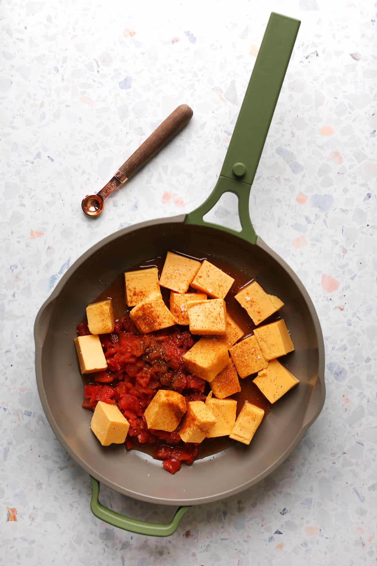 In a medium size pan or pot, add the cubed cheese, Rotel (do not drain), chili powder, cayenne, and a little salt and pepper.