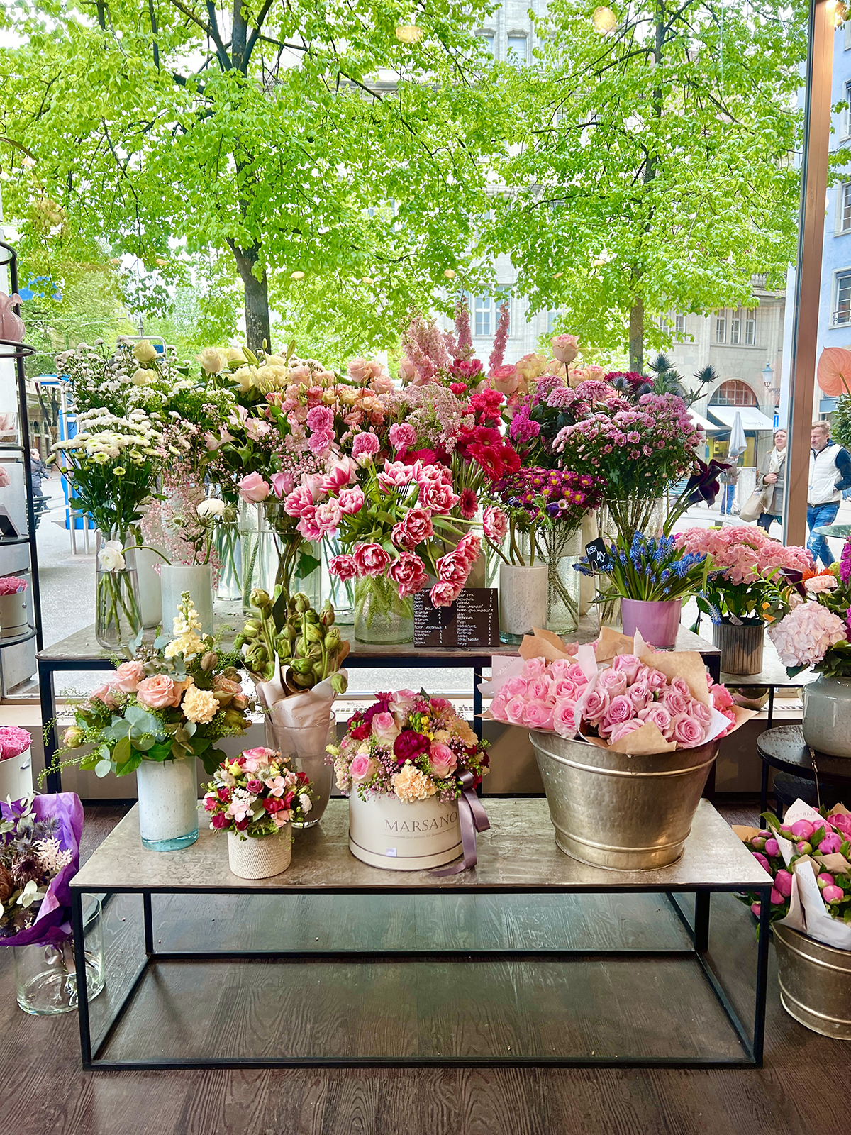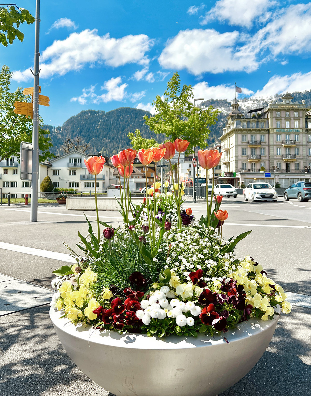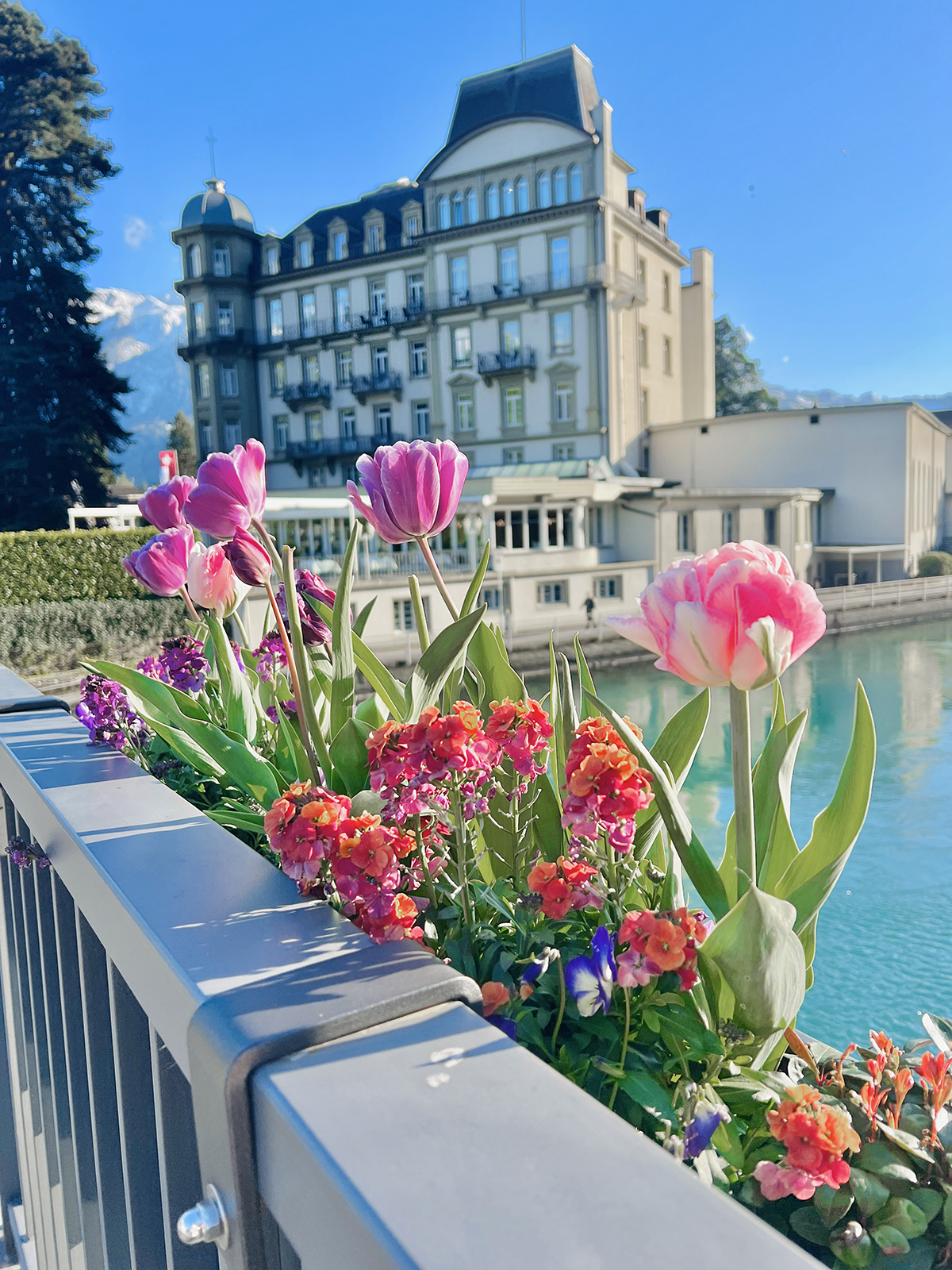 We rode a very scenic train from Zurich through Bern down to the Interlakken Valley. Your eyes can’t even take in the scenery, it’s incredible. Little Swiss chalets, sheep and cows, a valley of vivid green filled with flowers in bloom. You’ll notice my obsession with the cement flower pots around town. Whomever is responsible for the flower beds around town deserves an award in gardening. 🙂