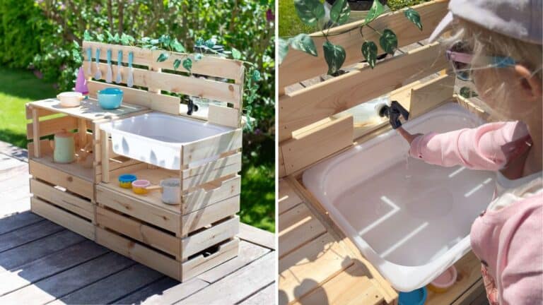 Outdoor play got an upgrade with IKEA mud kitchens. This mom transformed IKEA crates into a fun outdoor kitchen where kids can “cook” with nature and wash up with a functioning tap.