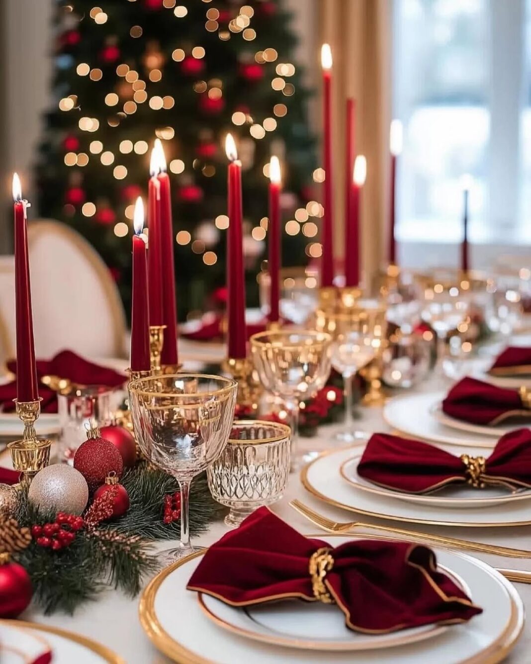 This table setting feels like stepping into a scene from a holiday film — the kind where the candles never drip, and the champagne never stops flowing. Deep red napkins tied with golden rings sit gracefully beside crystal glassware, while rich gold flatware glimmers in candlelight. Every detail whispers luxury without trying too hard — the kind of elegance that only comes from perfect balance.