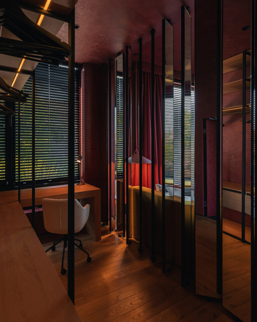 Tucked beside the master suite, the study carries the same rich palette: deep burgundy walls, warm wood, and sleek black framing. The desk sits by a large window filtered through dark blinds. Subtle lighting along the shelves adds a golden edge to the moody tones, making the space feel intimate and inspiring.
