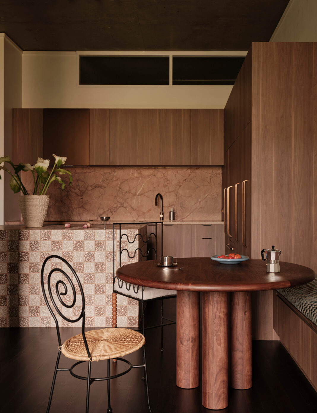 The kitchen island also features a striking use of tiles, cut down into smaller pieces to form a custom pattern. The impact is reminiscent of a chessboard, hence the project’s nickname, The Gambit Loft.