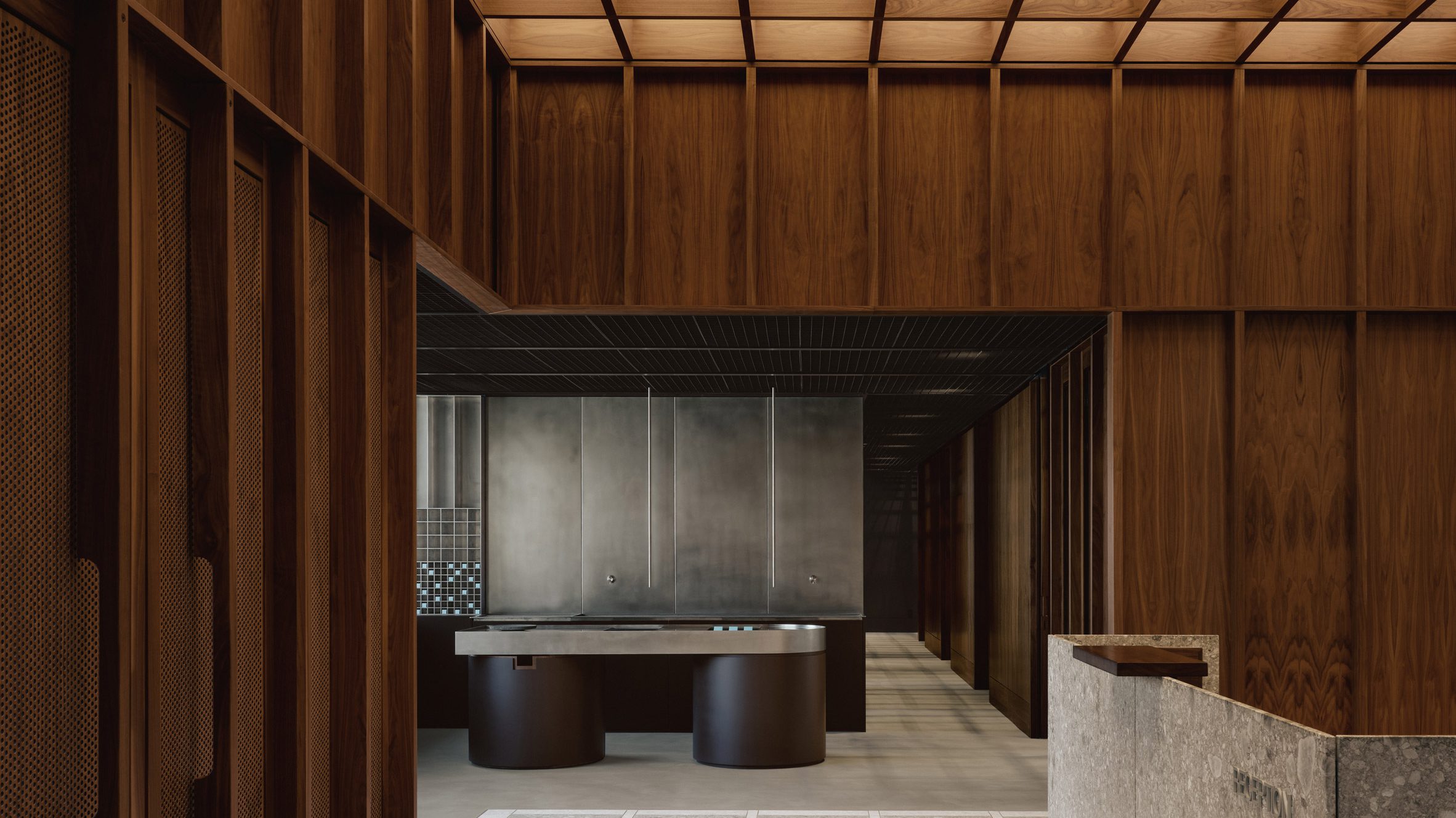 Walnut panelling wraps the space and aligns with a coffered ceiling grid that spans a skylight above, bringing in diffused natural light.