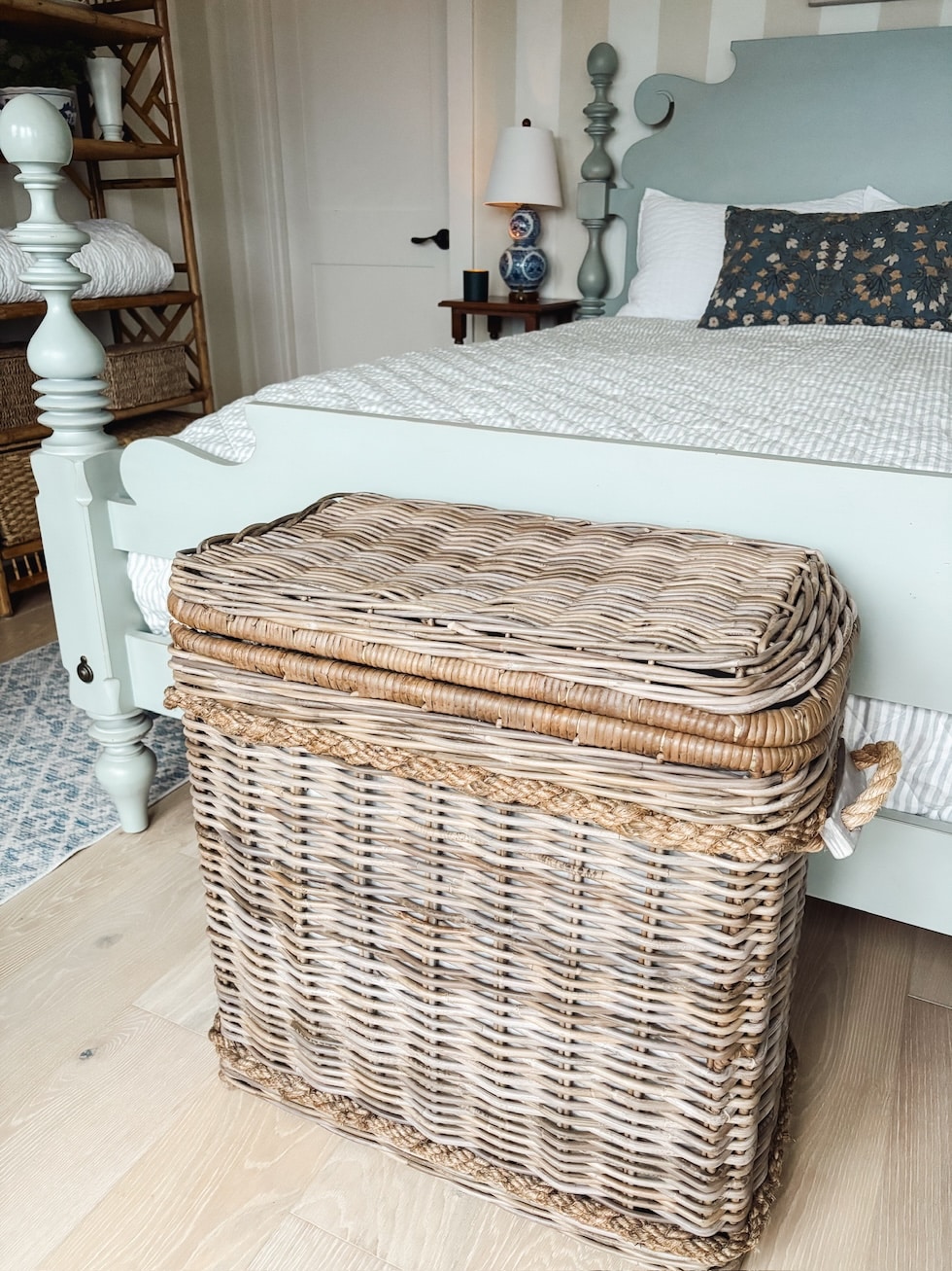 Classic pieces like this lidded laundry basket are wonderful because they can serve in any room as an attractive storage piece. It’s easy to move around.