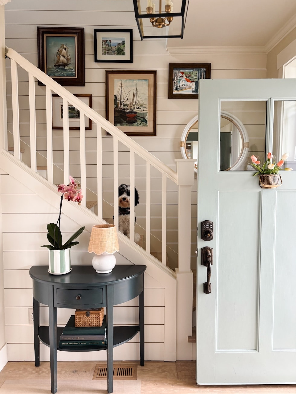 Now it feels welcoming with simple touches: tulips in our brass door knocker, the cute striped pot with an orchid on the entry table and swapped to this lamp for a lighter mood.