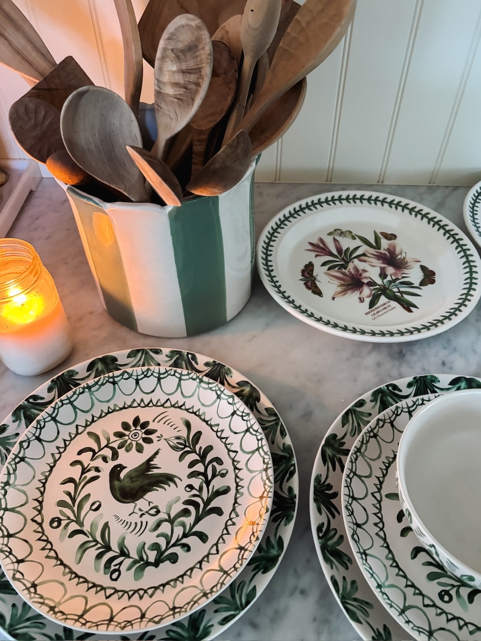 Collecting dishes that all coordinate or just go together even if they don’t “match” makes each season feel fresh in our kitchen…simply by pairing them together in different ways. I can refresh my own mood that way too, when the season changes or inspiration strikes.