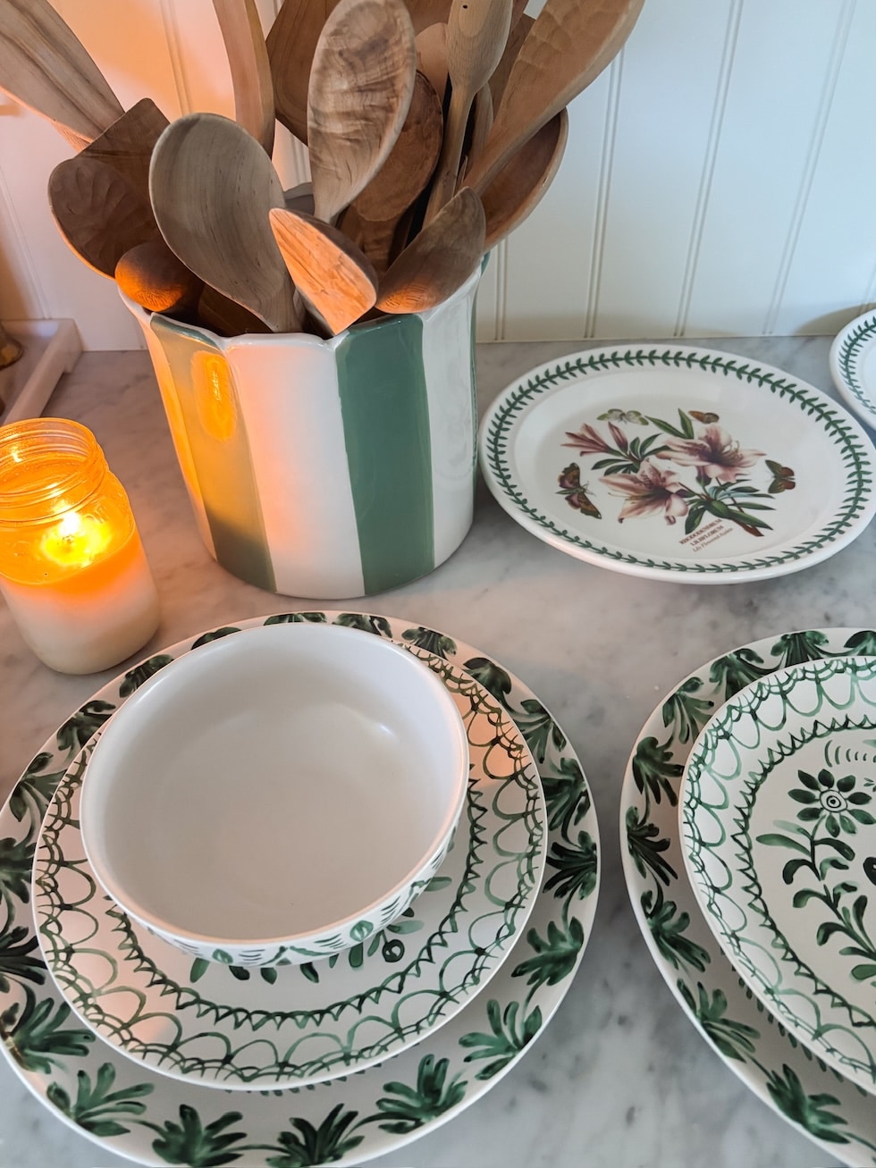 This Green and White Dish Set – This set of dishes comes with the two different sized plates and the bowls — it also comes in a blue set (it’s so cute in blue too!) so I think blue might be my next addition to our plate collection and my therapy for this season.