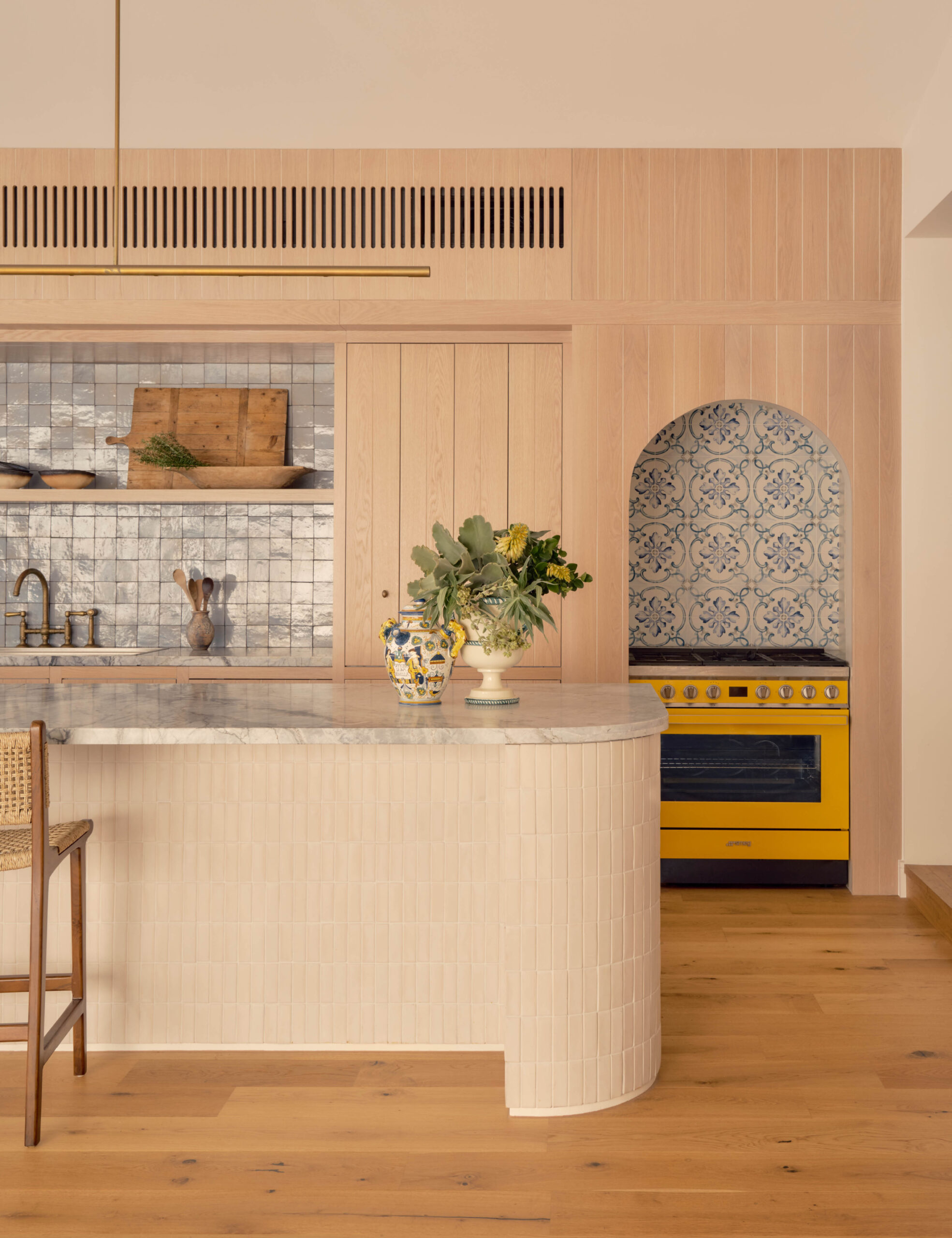 The kitchen features patterned tiles reminiscent of Mediterranean courtyards under the Portofino sun. The over-the-top charm of their handpainted designs ground the space without pulling focus.
